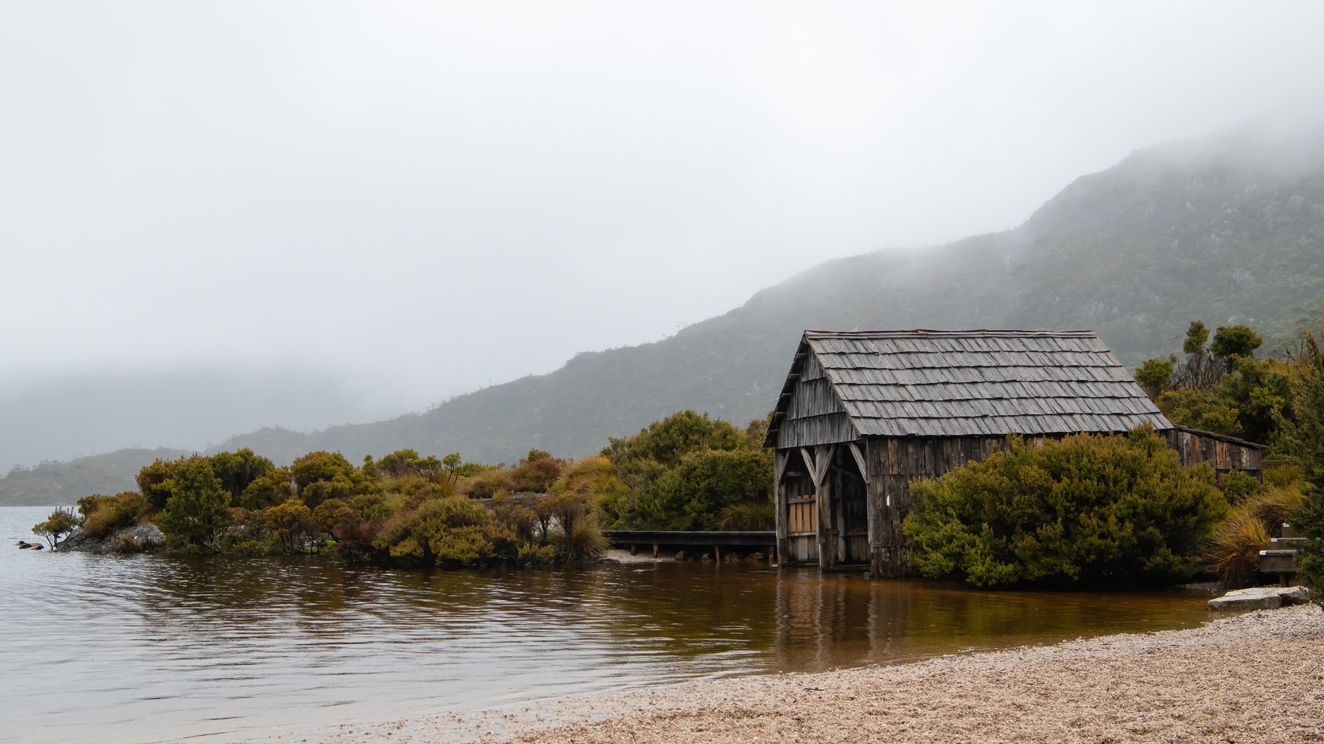 Entdecken Sie eine friedliche Szene mit einer alten Hütte am See und einer atemberaubenden Naturkulisse. Laden Sie dieses beruhigende 4K Wallpaper jetzt kostenlos herunter.