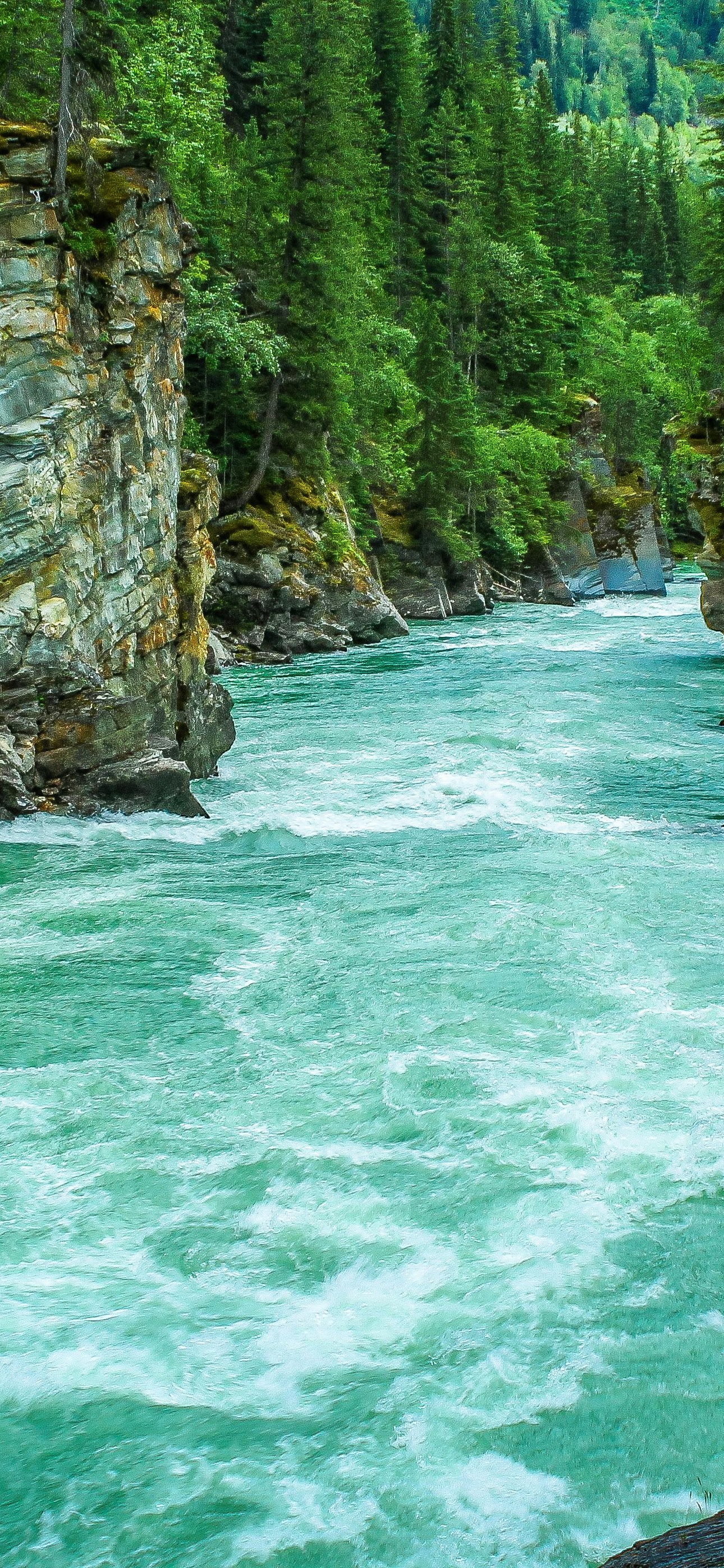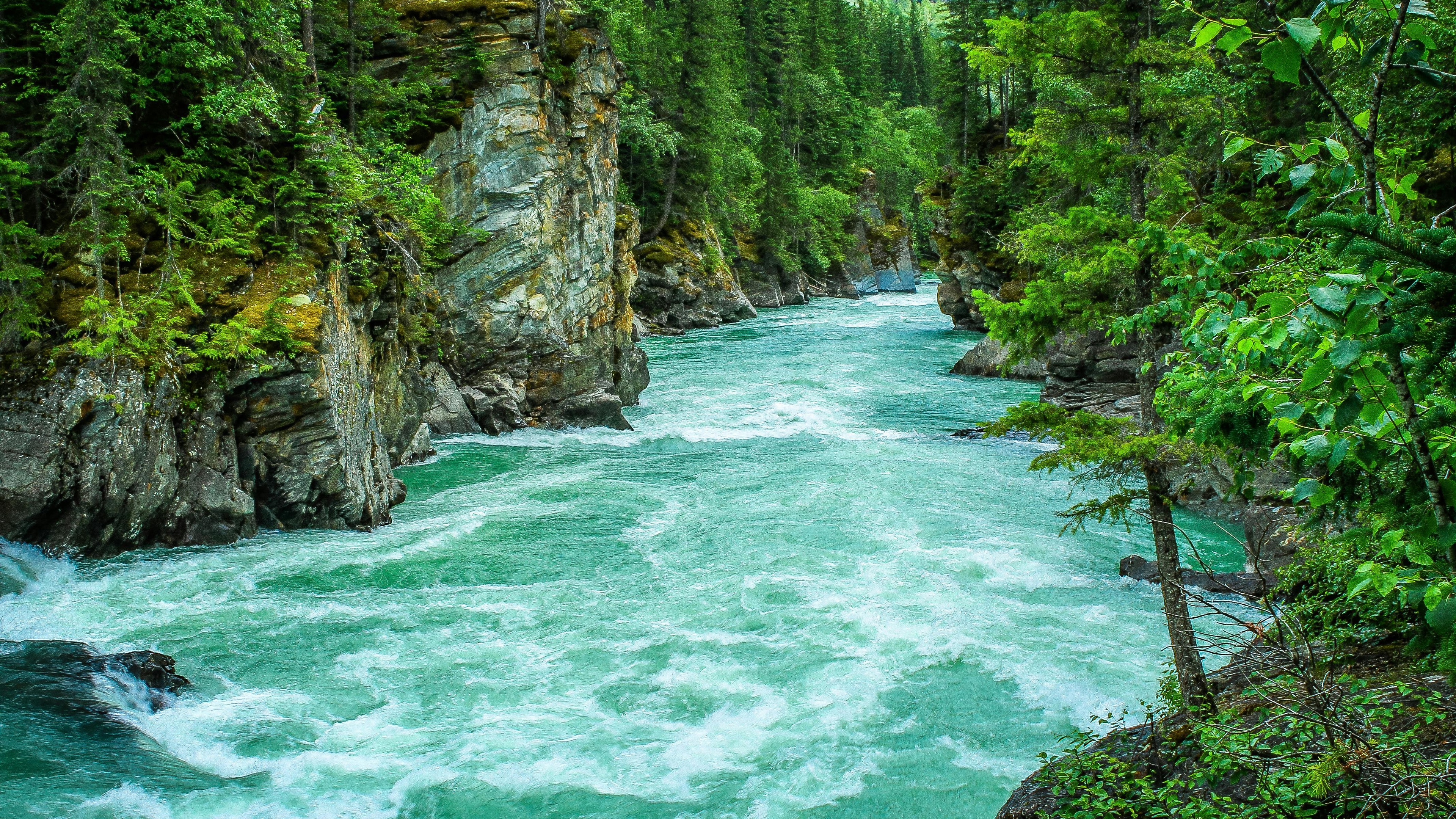 Ein klarer Fluss, der sich ruhig durch einen grünen Wald schlängelt. Perfektes 4K Hintergrundbild für Natur- und Landschaftsliebhaber.