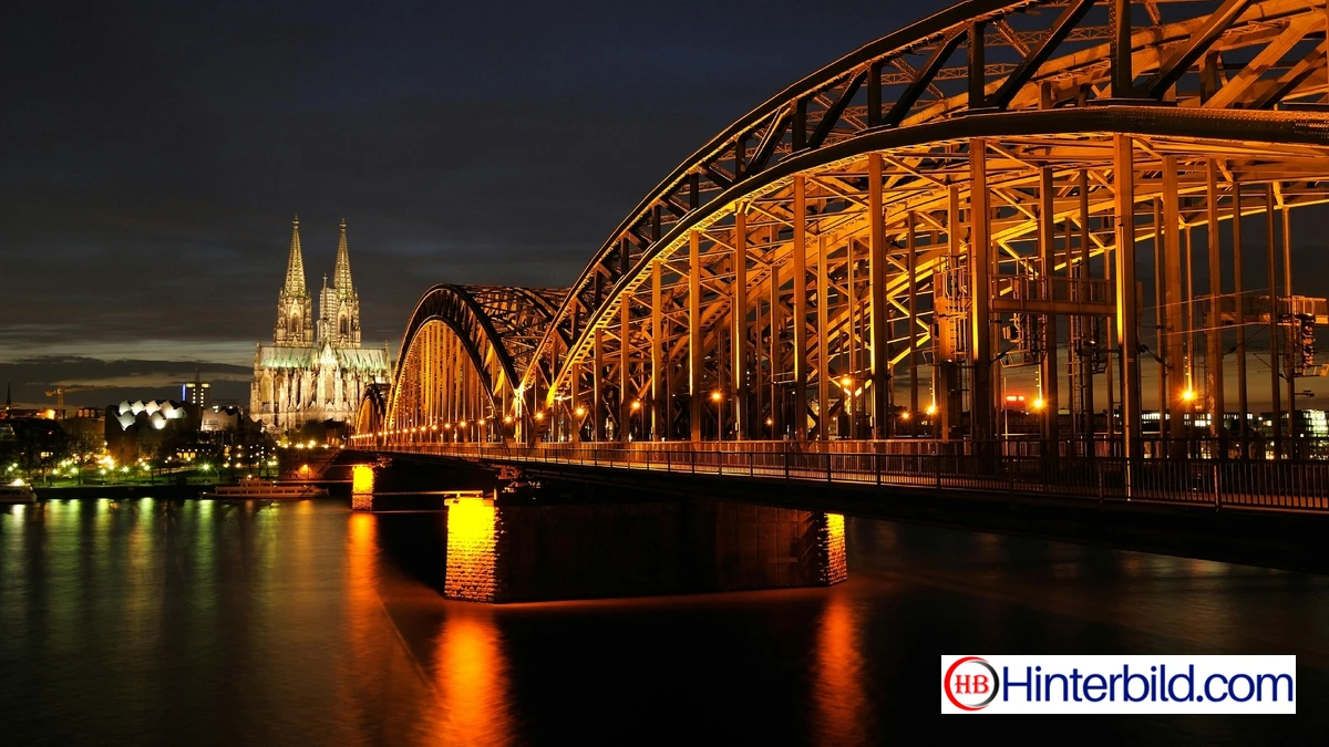Beeindruckendes Architekturfoto der Hohenzollernbrücke in Köln, hell erleuchtet in der Nacht mit malerischer Spiegelung im Rhein. Perfektes 4K Hintergrundbild für Architektur- und Städtefotografie-Fans.
