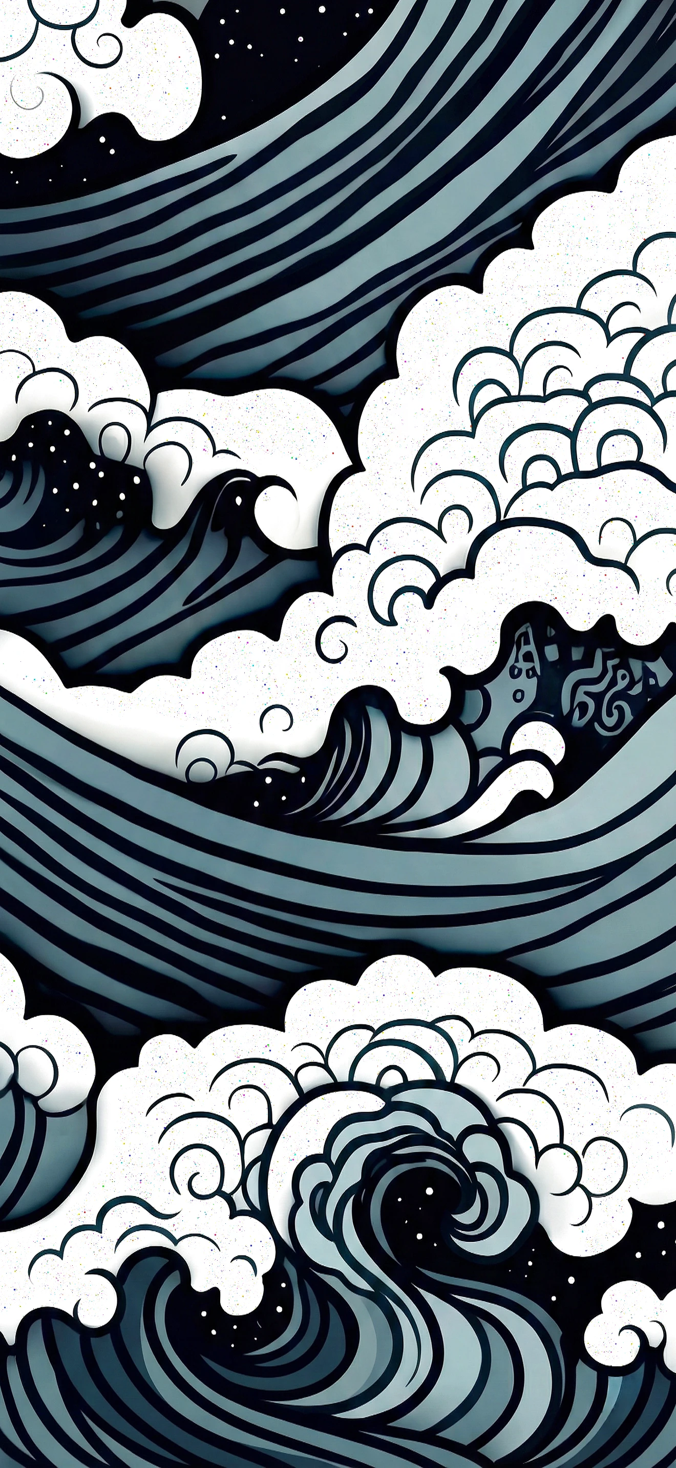 Anstatt der traditionellen Farbpalette nutzt dieses Kunstwerk eine kraftvolle monochrome Skala. Tiefe, dunkle Blautöne, abgestufte Graunuancen, reines Weiß und tiefes Schwarz erzeugen einen Kontrast, der sowohl dramatisch als auch unglaublich beruhigend wirkt. Der Stil erinnert an Scherenschnittkunst oder modernes Vektordesign, mit klaren, kräftigen Linien, die den Wellen und Wolken eine fast skulpturale Qualität verleihen.