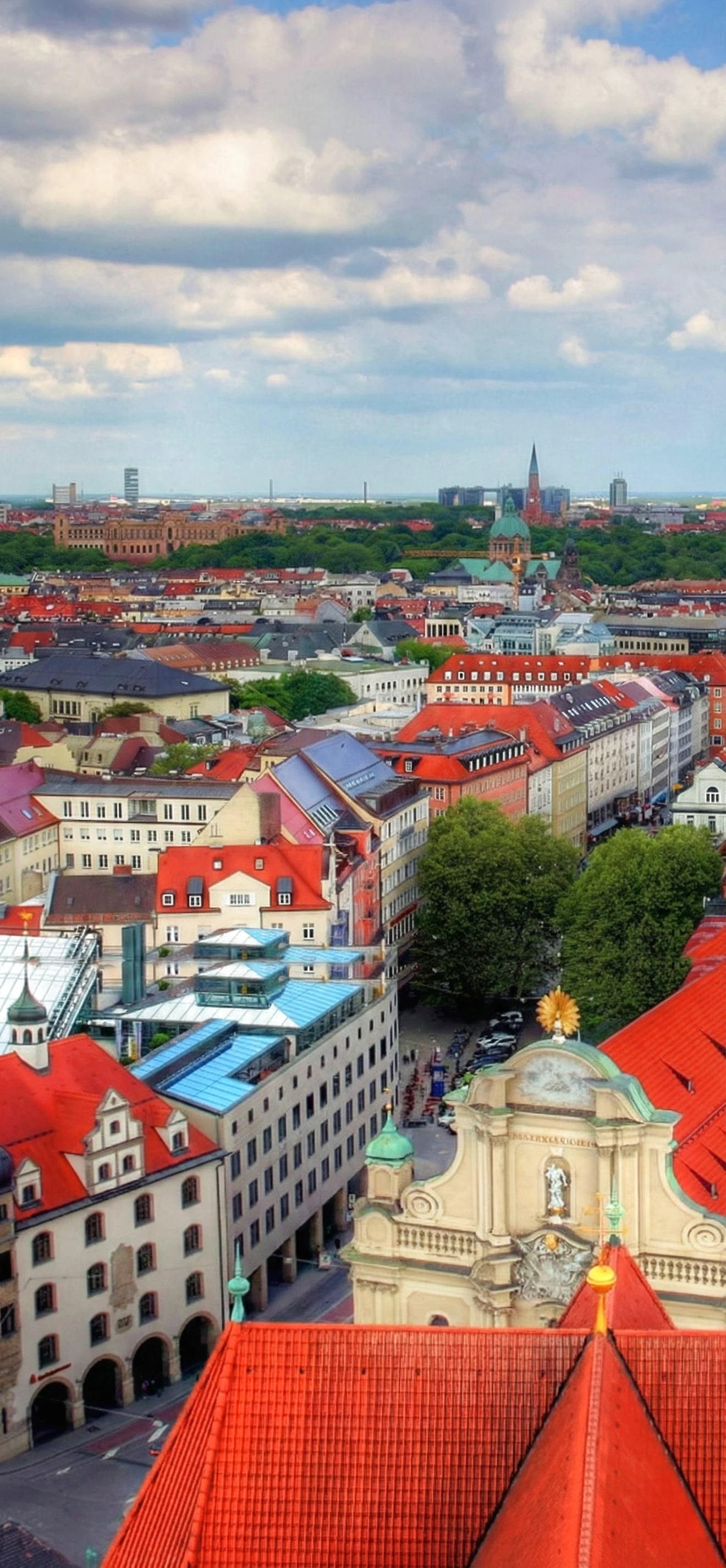 München ist eine Stadt, die ihre Geschichte stolz auf ihren Dächern trägt. Wer einmal auf dem "Alten Peter" stand oder aus einem der oberen Stockwerke des Rathauses blickte, kennt diesen unverwechselbaren Anblick: Ein schier endloses Meer aus roten Ziegeldächern, unterbrochen von prachtvollen Kirchtürmen und grünen Oasen. Auf hinterbild.de präsentieren wir dir heute ein ganz besonderes Schmuckstück für dein Smartphone. Dieses hochauflösende Hintergrundbild im Format 1320 x 2868 Pixel fängt die bayerische Landeshauptstadt an einem hellen, lebendigen Tag ein. Es ist die perfekte Wahl für alle, die das urbane Leben und die historische Architektur lieben.