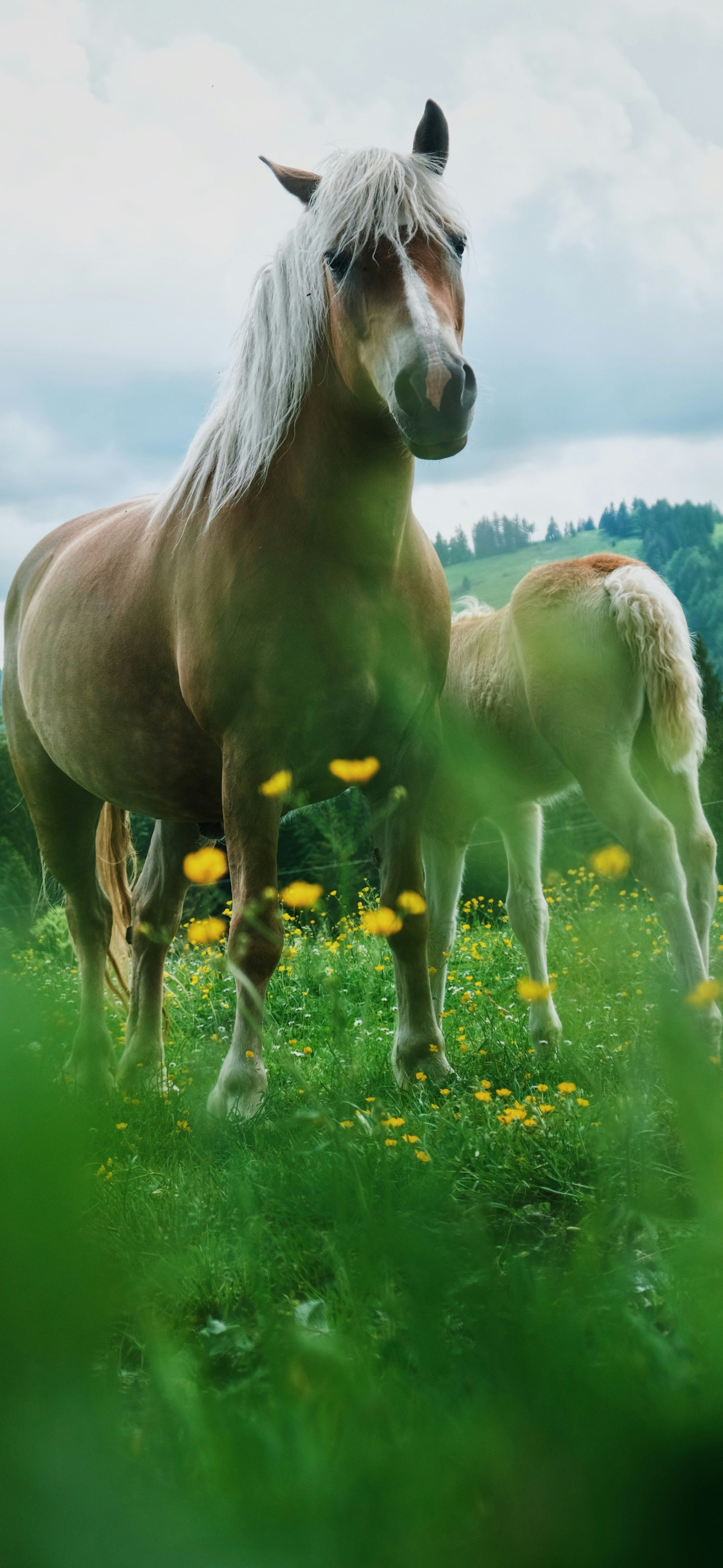 Entdecke wunderschöne Pferdebilder: Eine Stute mit ihrem Fohlen auf einer grünen Wiese. Ideal als kostenloses 4K Hintergrundbild für Desktop, iPhone oder Android.