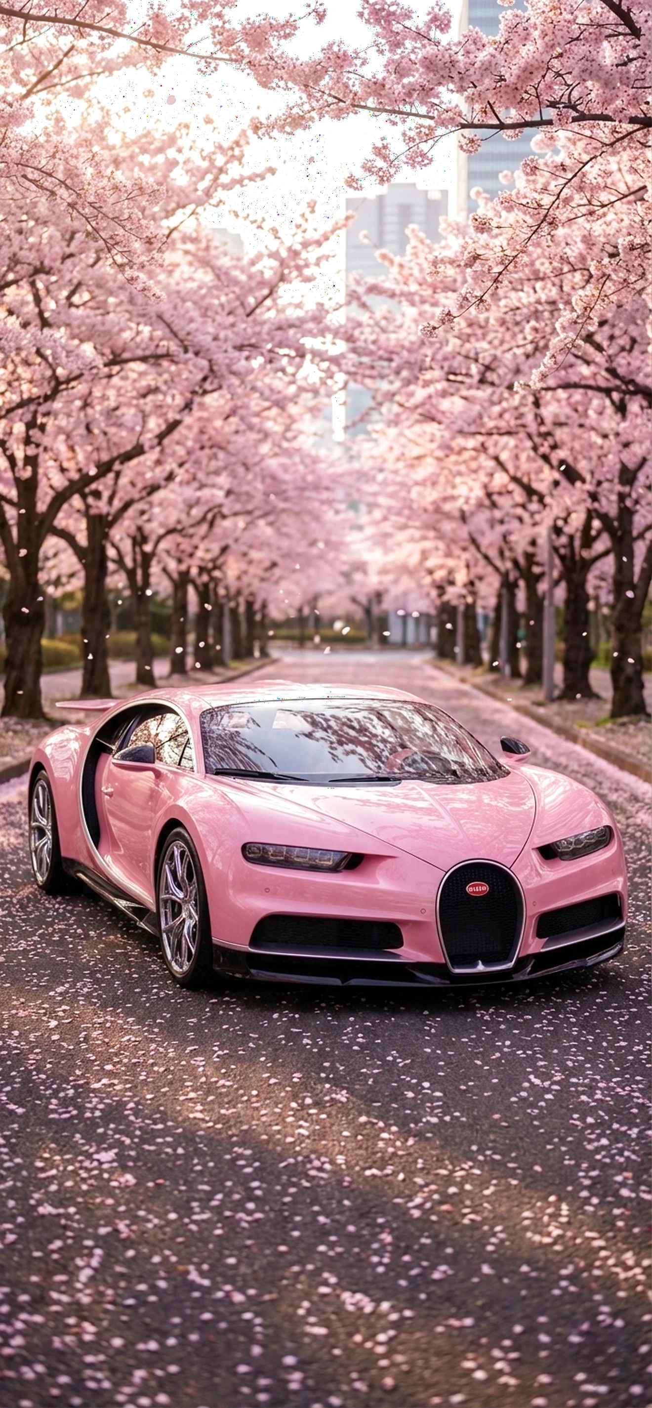 Der ultimative Frühlingstraum: Ein pinker Bugatti Chiron unter Kirschblüten als Handy-Wallpaper