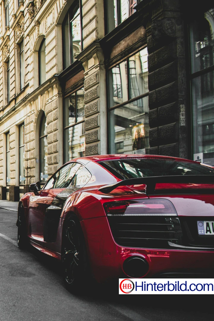 Rotes und schwarzes Audi R8 Coupé vor Betongebäude