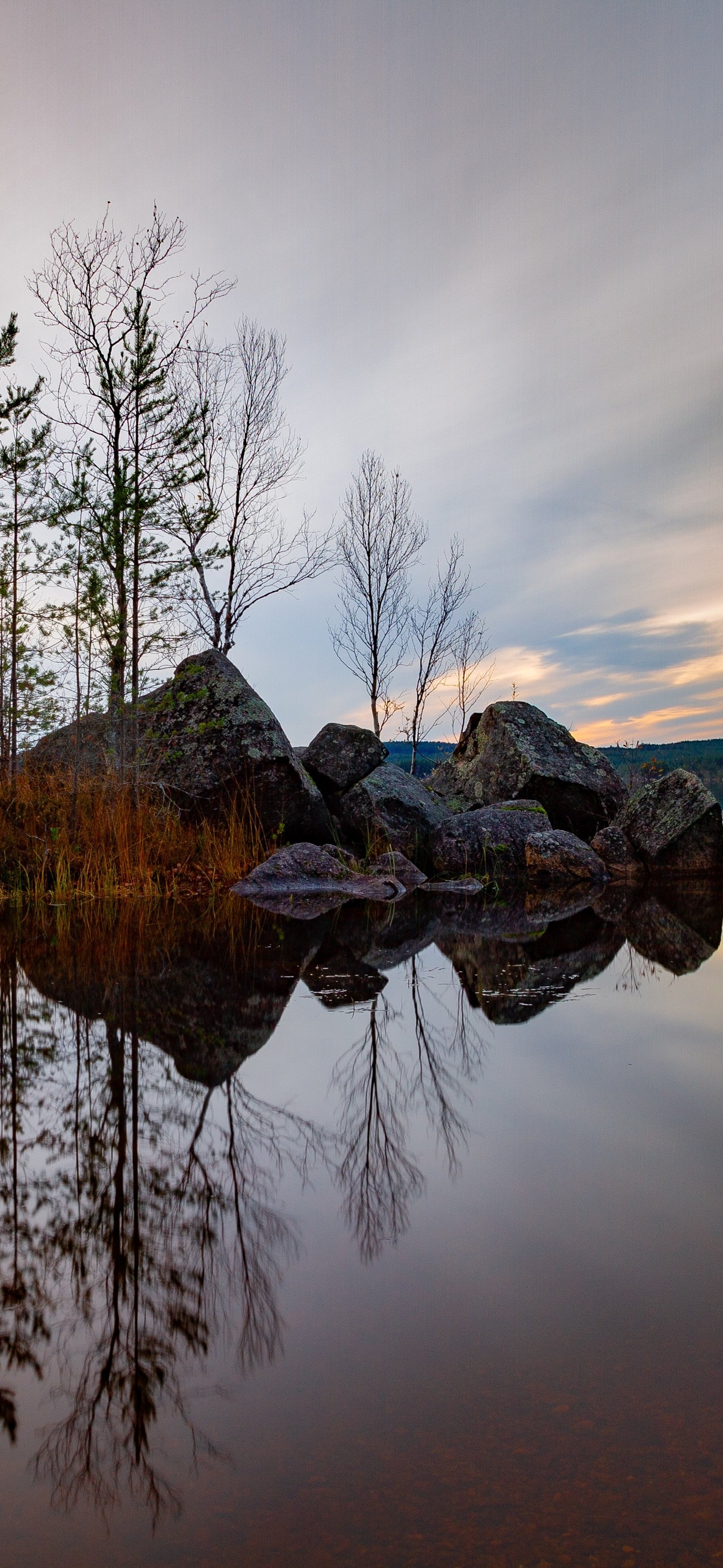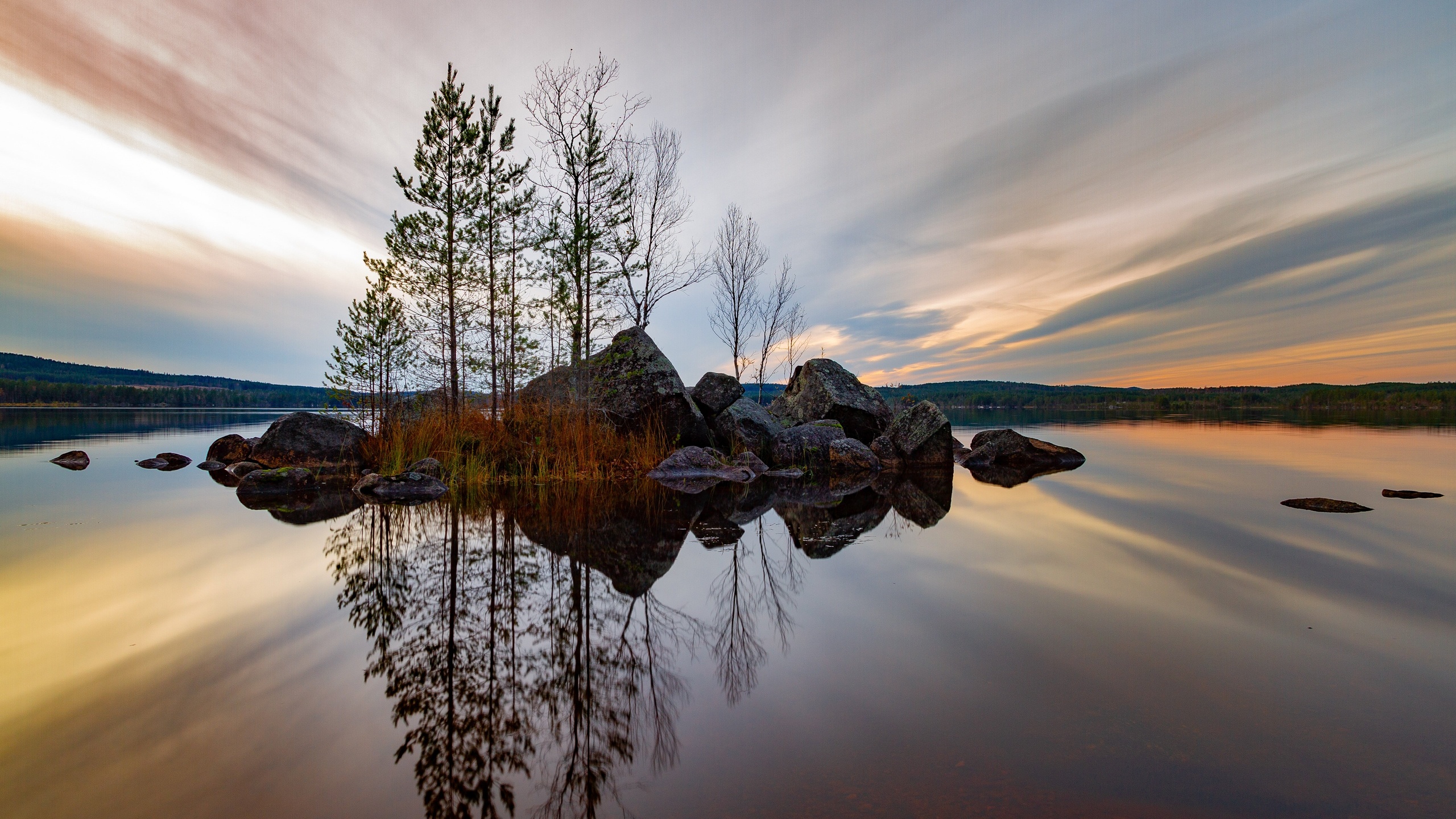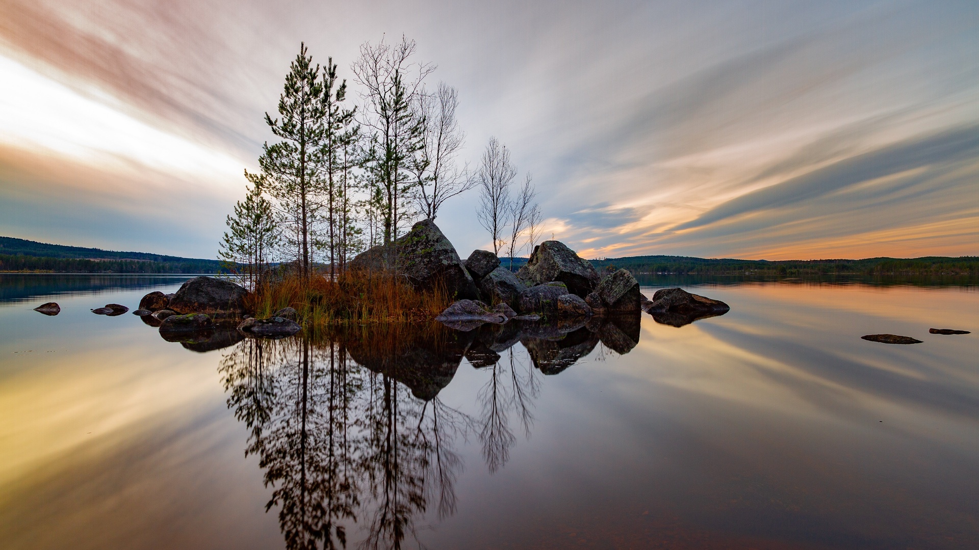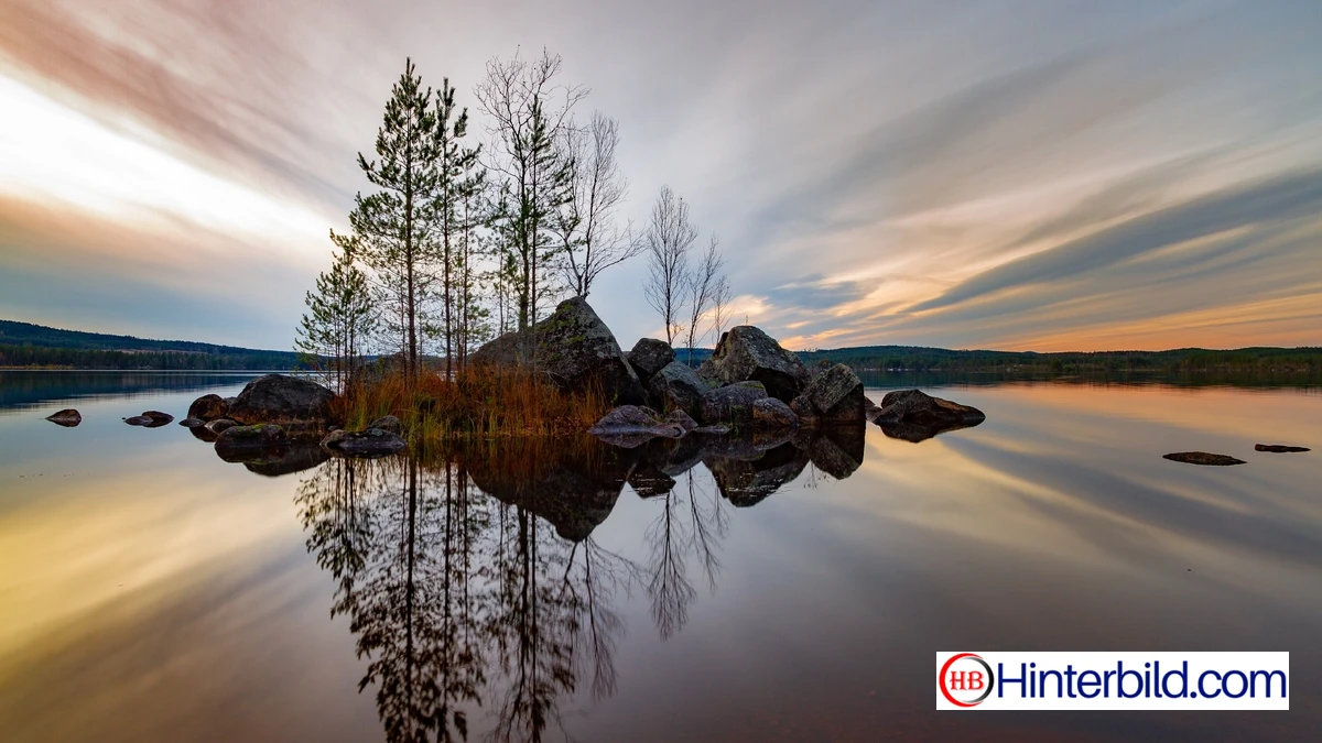 Genießen Sie die friedliche Stimmung einer ruhigen See-Landschaft mit perfekter Spiegelung der Natur. Jetzt dieses beeindruckende 4K Wallpaper kostenlos herunterladen.