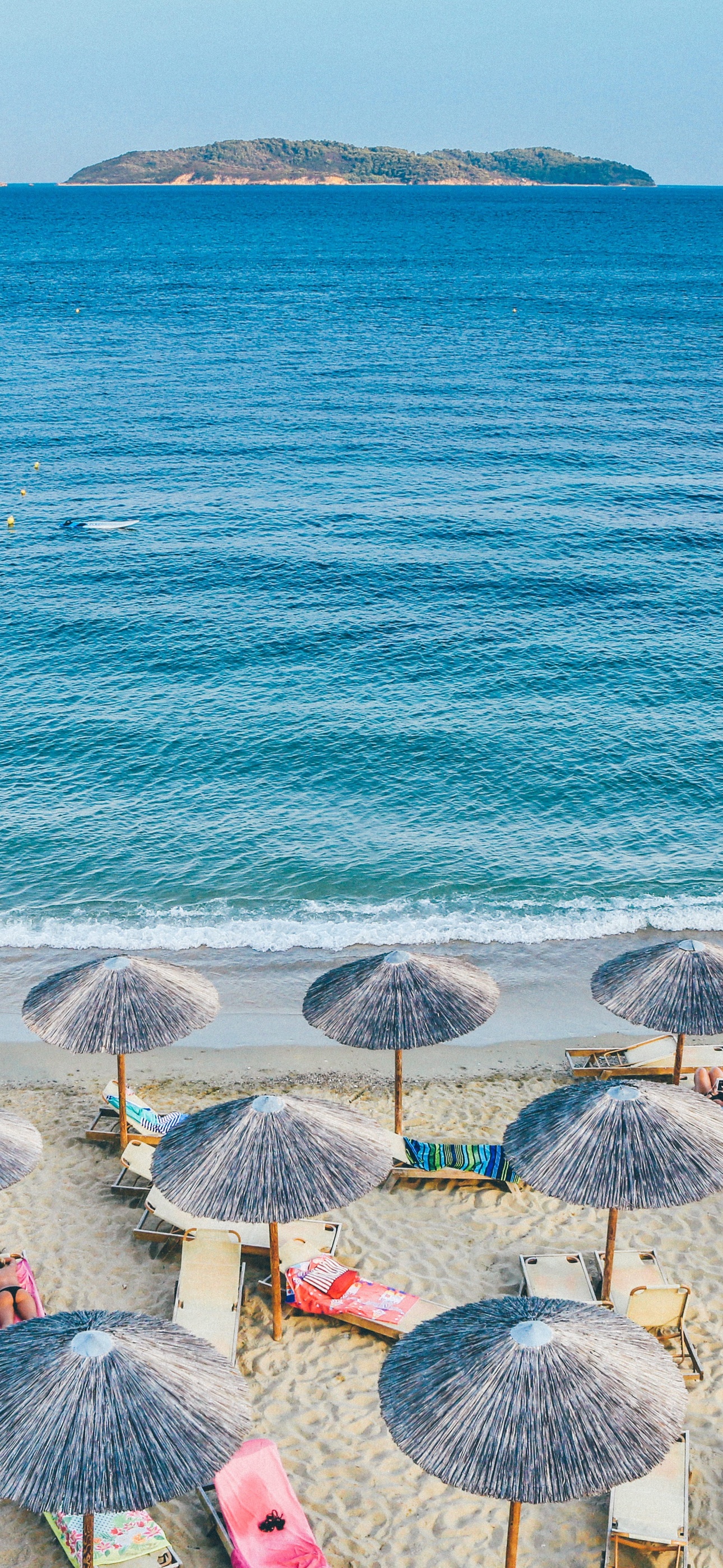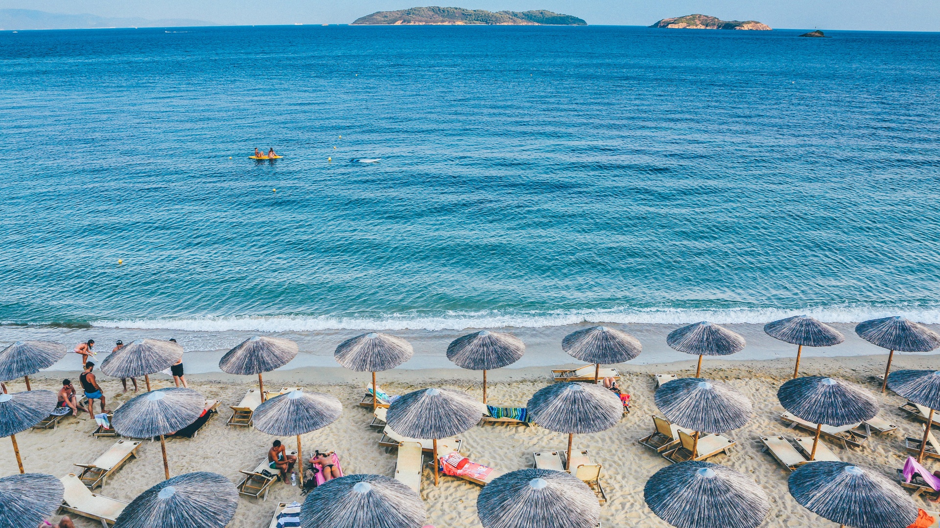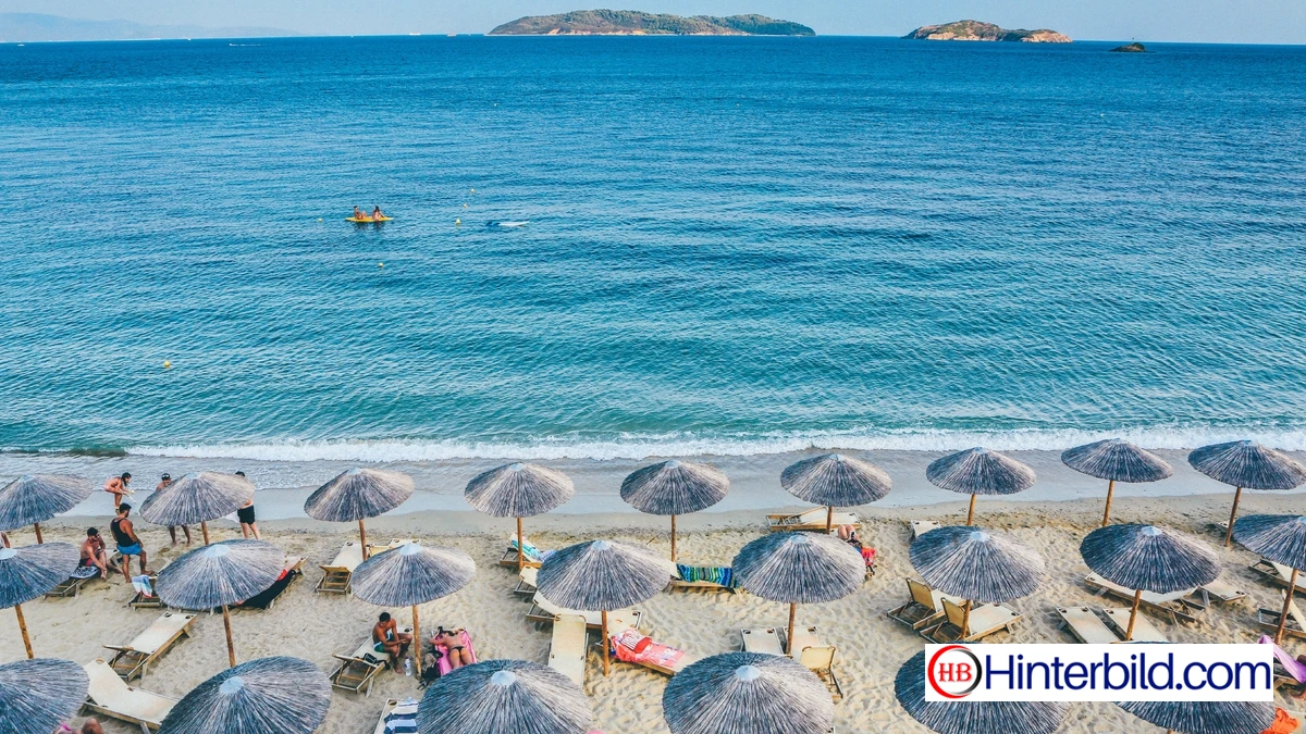 Ein sonniger Strand mit bunten Sonnenschirmen direkt am türkisblauen Meer. Perfektes 4K Hintergrundbild für Sommerfeeling und Urlaubsstimmung.