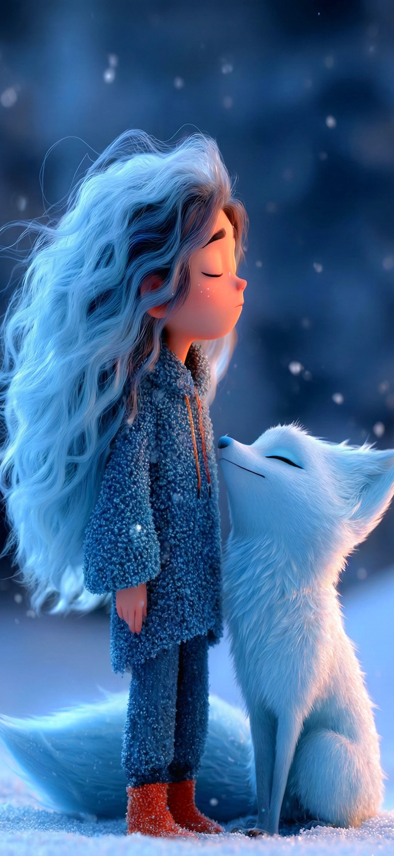 Dieses Wallpaper zeigt ein junges Mädchen mit wildem, eisblauem Haar und einen eleganten weißen Polarfuchs. Beide stehen sich Stirn an Stirn gegenüber, die Augen sanft geschlossen, versunken in einem Moment absoluter Ruhe. Der Stil erinnert an hochwertige 3D-Animationen großer Filmstudios wie Pixar oder Disney und bringt genau diese hochwertige, träumerische Ästhetik auf Ihr Smartphone.