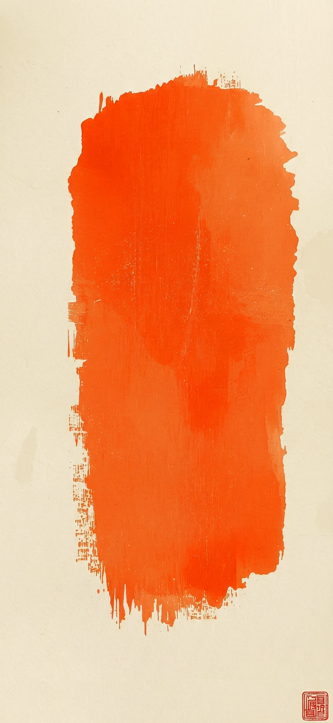 Dieses Design hingegen lebt von seiner Textur. Der Pinselstrich ist dynamisch, man sieht die feinen Linien der Borsten, die Unregelmäßigkeiten an den Rändern und die Variationen in der Farbsättigung. Es hat eine fast haptische Qualität, die an traditionelle Zen-Kalligraphie erinnert, aber modern interpretiert wird. Der weiche, beige- cremefarbene Hintergrund sorgt für den nötigen visuellen "Ruheraum", damit der orange Akzent strahlen kann, ohne Ihre Augen zu überanstrengen.