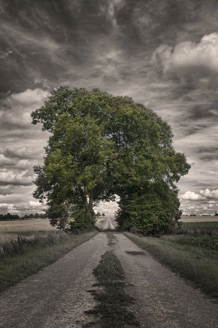 Dieses Hintergrundbild mit Weg, Bäumen und Wolken bringt Natur und Frieden auf dein Gerät. Ein kostenloses, schlichtes iPhone Hintergrundbild, das ideal für alle ist, die eine harmonische Verbindung von Natur und Design suchen.