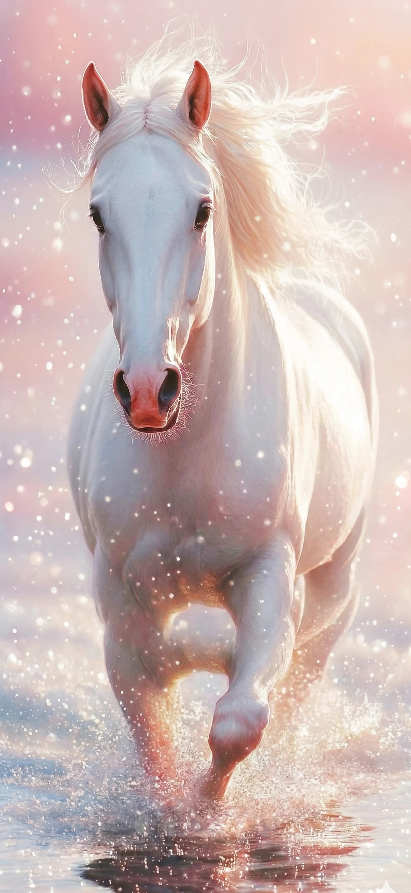 Das weiße Pferd gilt seit Jahrhunderten als Symbol für Reinheit, Freiheit, Stärke und Eleganz. In diesem außergewöhnlichen Wallpaper wird diese Symbolik visuell eindrucksvoll umgesetzt. Das Bild zeigt ein kraftvolles, weißes Pferd, das durch seichtes Wasser läuft, umgeben von funkelnden Lichtpartikeln und einer sanften, fast märchenhaften Farbwelt. Dieses Motiv eignet sich ideal als Hintergrundbild für alle, die ihrem Smartphone oder Desktop eine emotionale und ästhetische Note verleihen möchten.